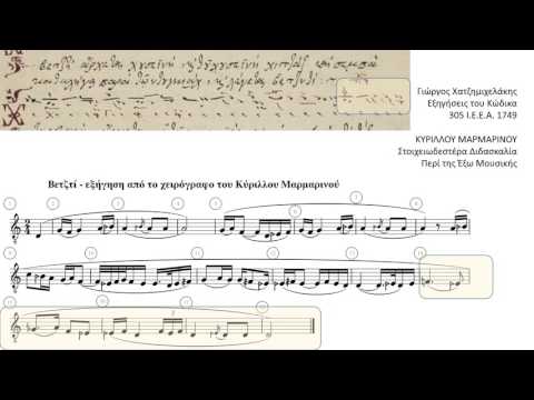 Γιώργος Χατζημιχελάκης: ανασύνθεση στο πεντάγραμμο των παραδειγμάτων για τα Μακάμια από το χειρόγραφο του Κυρίλλου Μαρμαρινού, κώδικας 305, έτος χρονολόγησης 1749, Ιστορική και Εθνολογική Εταιρεία Αθηνών (Ι.Ε.Ε.Α.)